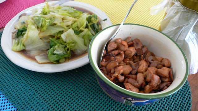 Fried cabbage and Fried Chicken meat with mushroom, ginger slices, seasame oil.