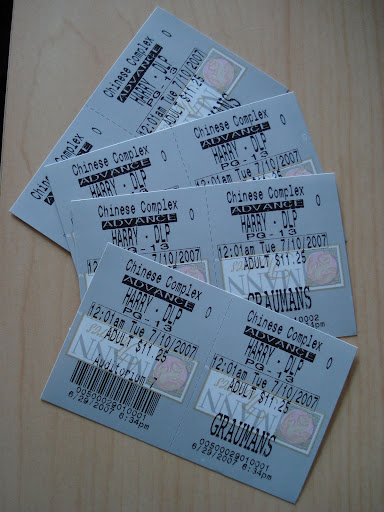 The ticket wrote 12.01am, July 10 2007. And having quiz on every lessons, me and frances pia the whole of monday to finish studying to compensate for watching movie over midnight and planned to head for class immediately the nxt day after we're back. So happily we study, happily cooked dinner and eat and we even packed our txtbook to bring there to read as we had planned to reach there early, expecting to have a crowd since its the premier day. Saw the prints of the few main actors/actress